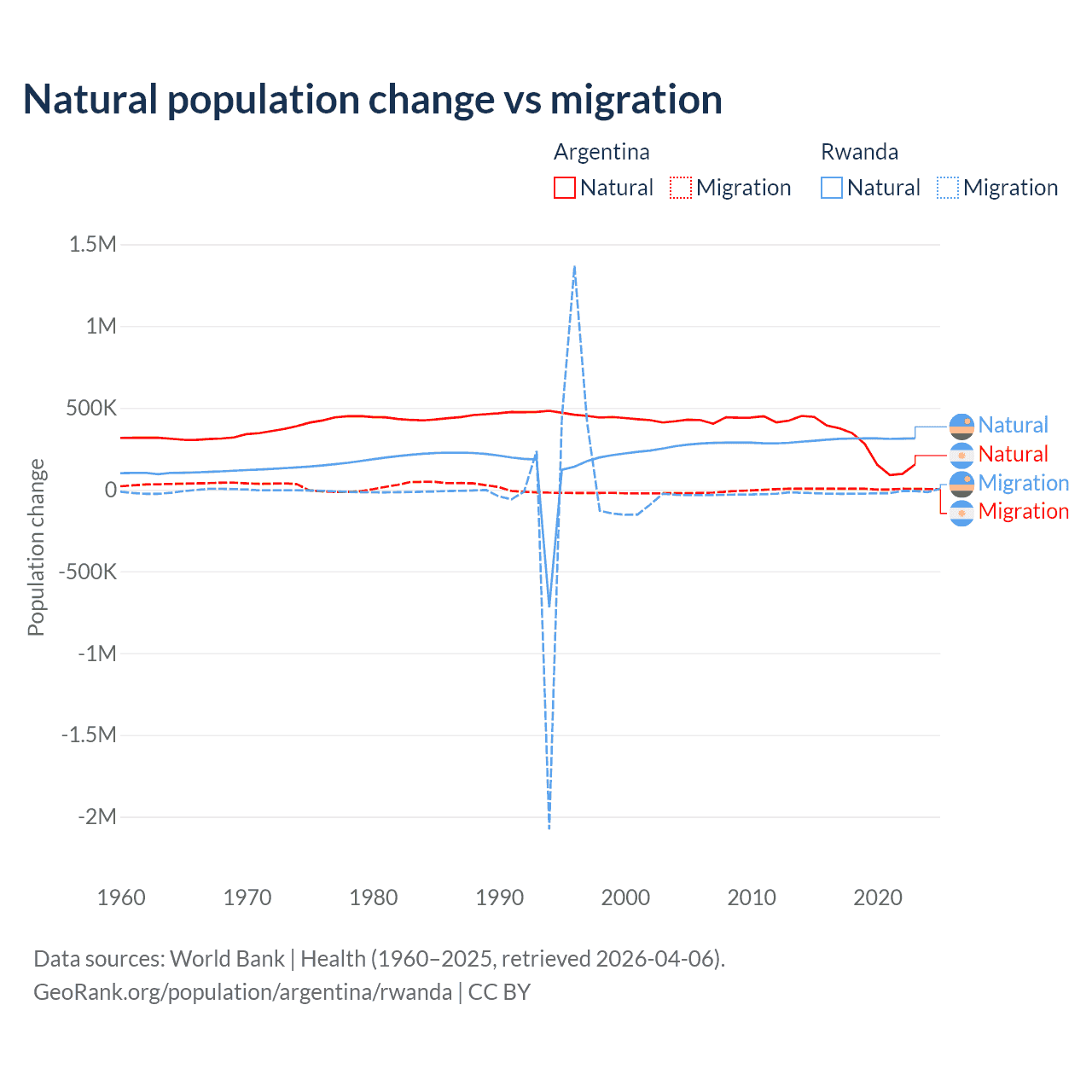 Over the last 10 years, 98.5% of the population change in Argentina is from natural causes (a gain of 2,779,031 people) and 1.52% is from migration (a gain of 42,871 people). In Rwanda 93.8% is from natural causes (a gain of 3,081,296 people) and 6.18% is from migration (a loss of 203,035 people).