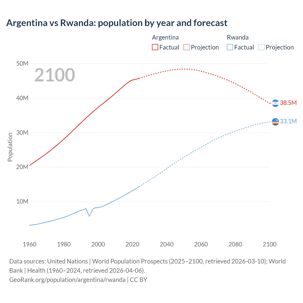 The latest officially reported population of Argentina was 45,696,159 in 2024 vs 14,256,567 people in Rwanda in 2024. In 2026, based on the adjusted UN estimation, the current Argentina's population is 46,048,053 people compared to 14,975,051 in Rwanda.