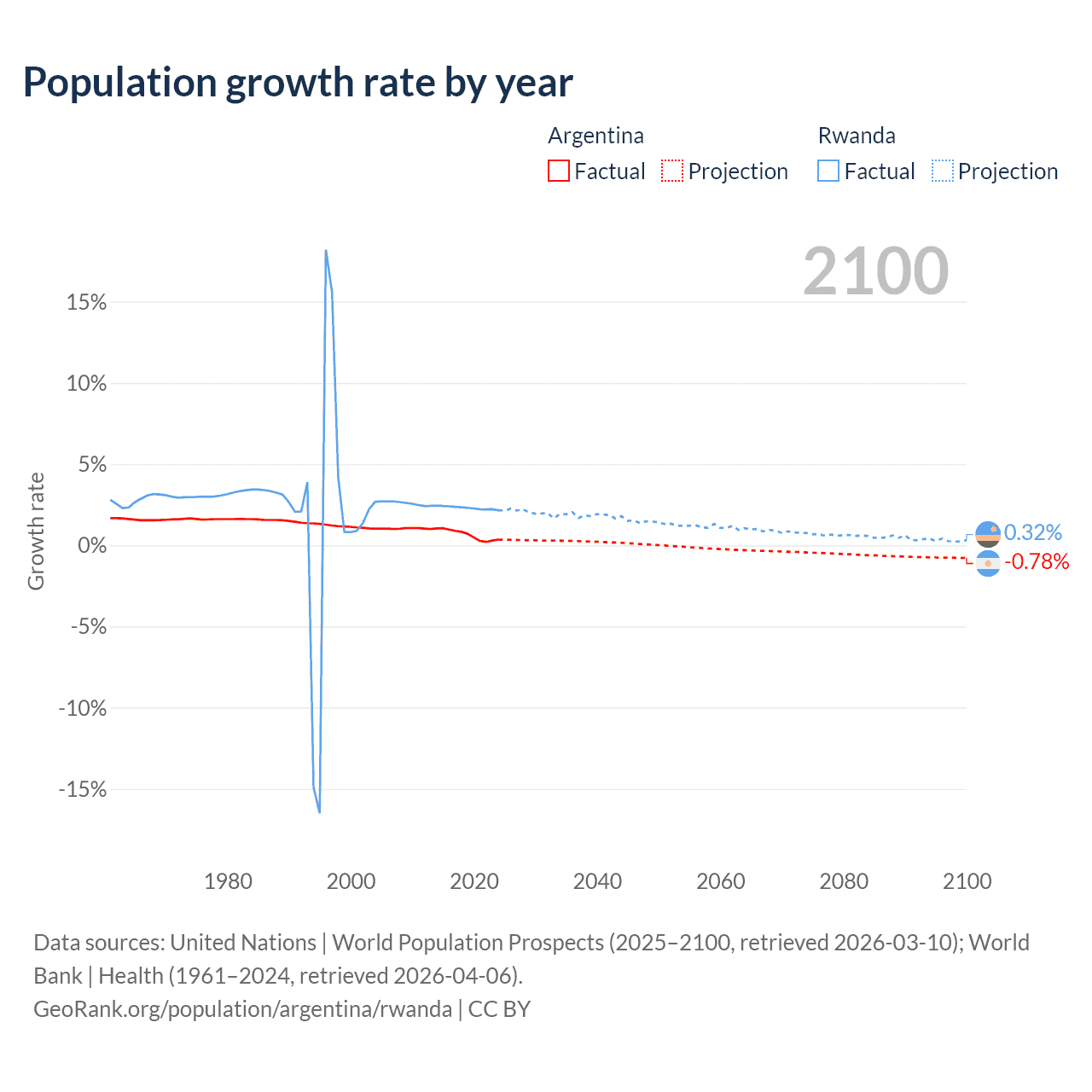 - For the last 10 years, Argentina has had an average growth rate of +0.64% per year vs +2.31% in Rwanda.