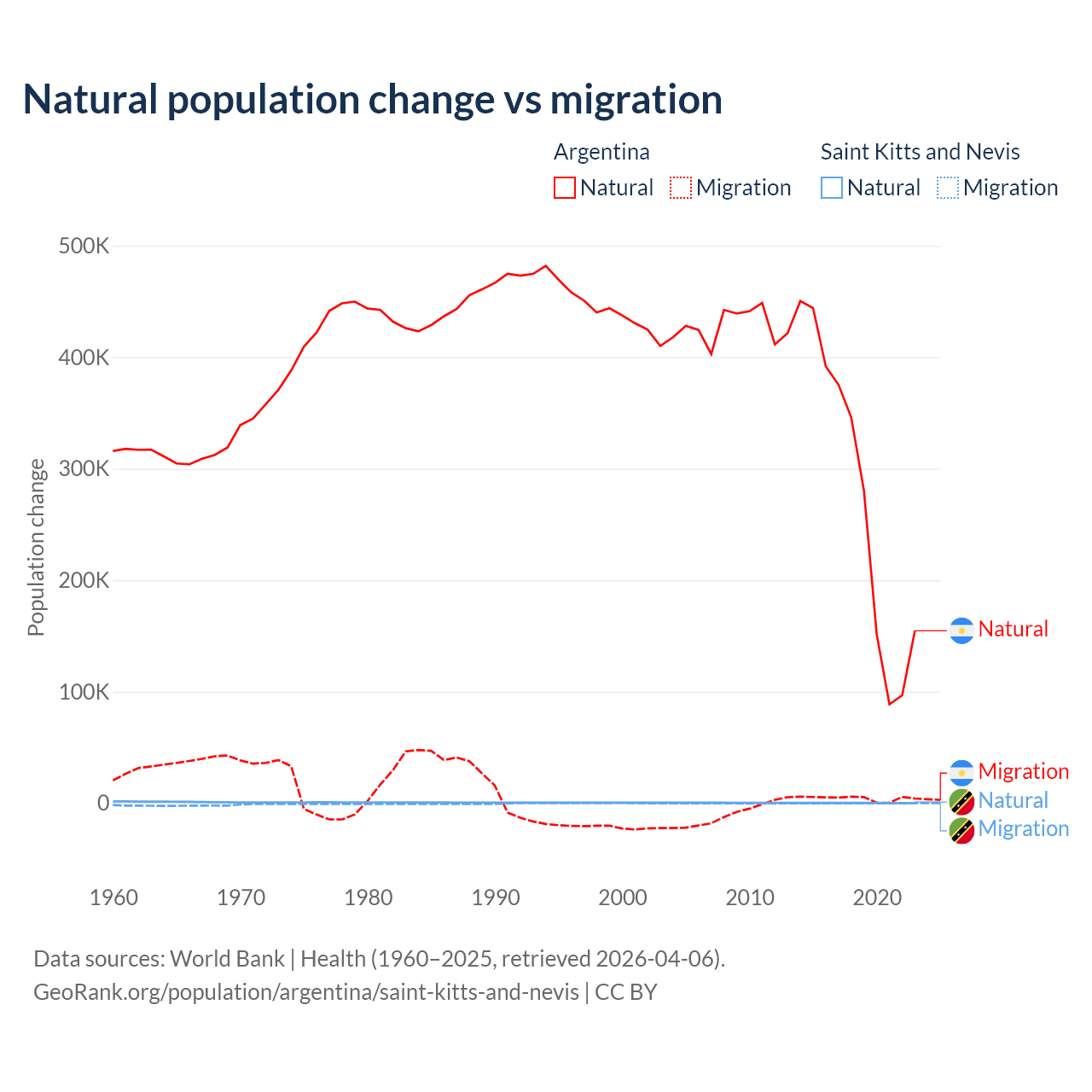 Over the last 10 years, 98.5% of the population change in Argentina is from natural causes (a gain of 2,779,031 people) and 1.52% is from migration (a gain of 42,871 people). In Saint Kitts and Nevis 44.9% is from natural causes (a gain of 1,225 people) and 55.1% is from migration (a loss of 1,506 people).