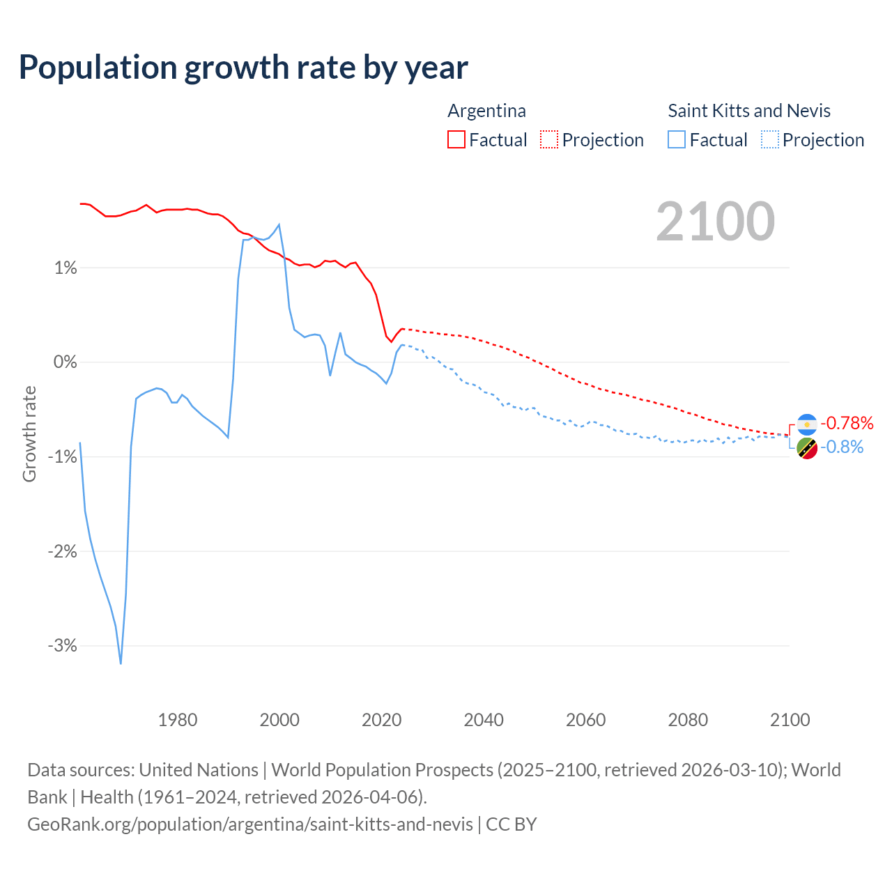 - For the last 10 years, Argentina has had an average growth rate of +0.64% per year vs -0.04% in Saint Kitts and Nevis.