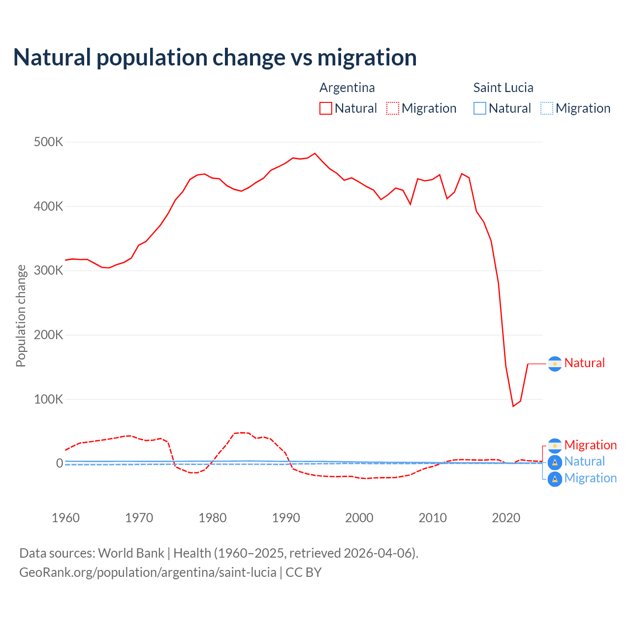 Over the last 10 years, 98.5% of the population change in Argentina is from natural causes (a gain of 2,779,031 people) and 1.52% is from migration (a gain of 42,871 people). In Saint Lucia 95.7% is from natural causes (a gain of 6,039 people) and 4.31% is from migration (a loss of 272 people).