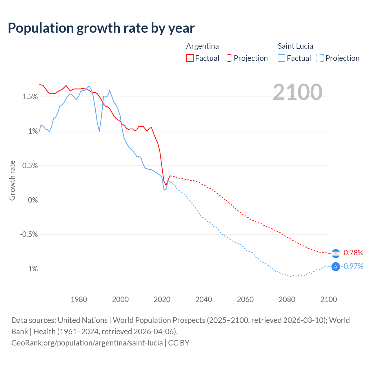 - For the last 10 years, Argentina has had an average growth rate of +0.64% per year vs +0.33% in Saint Lucia.
