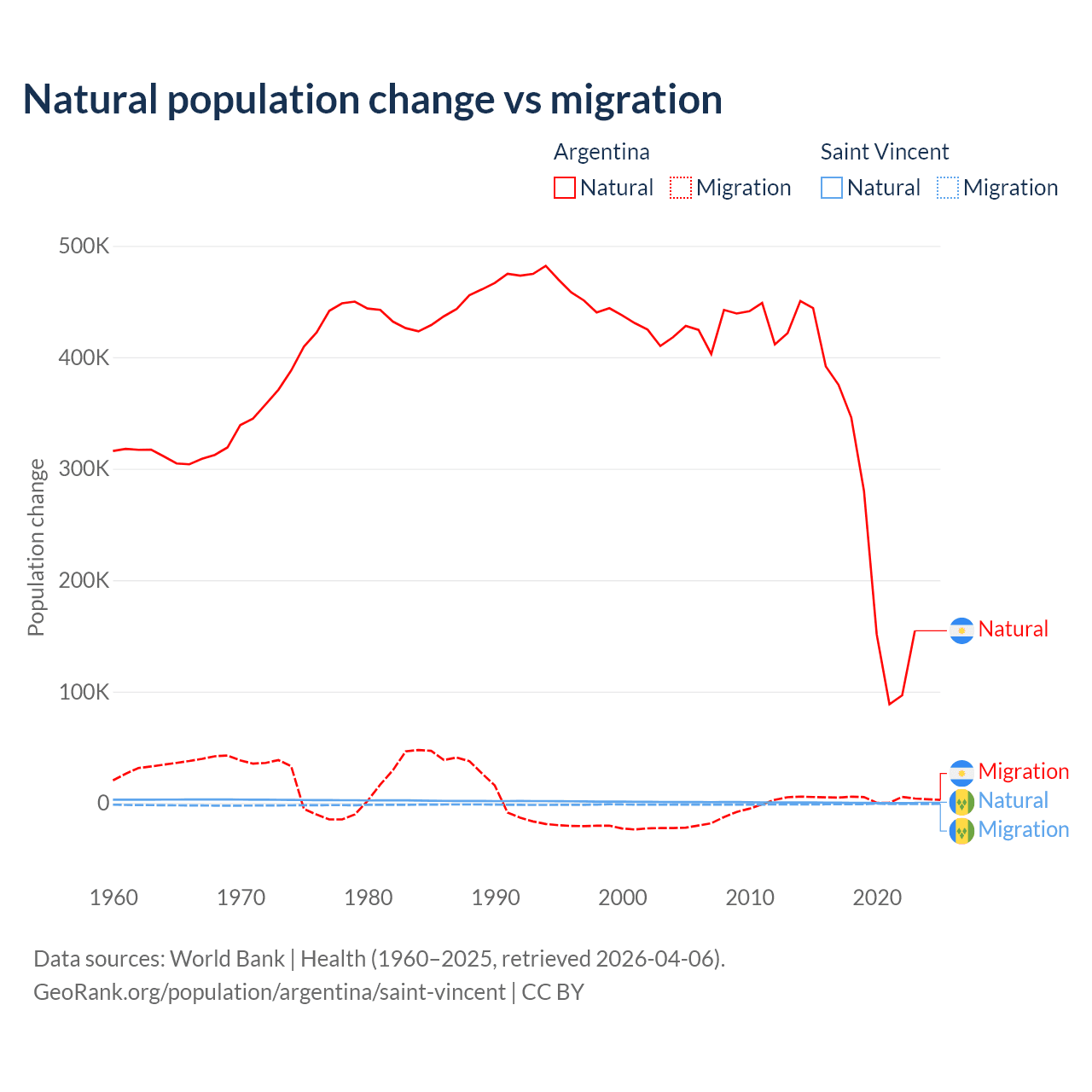 Over the last 10 years, 98.5% of the population change in Argentina is from natural causes (a gain of 2,779,031 people) and 1.52% is from migration (a gain of 42,871 people). In Saint Vincent 21.2% is from natural causes (a gain of 2,525 people) and 78.8% is from migration (a loss of 9,393 people).