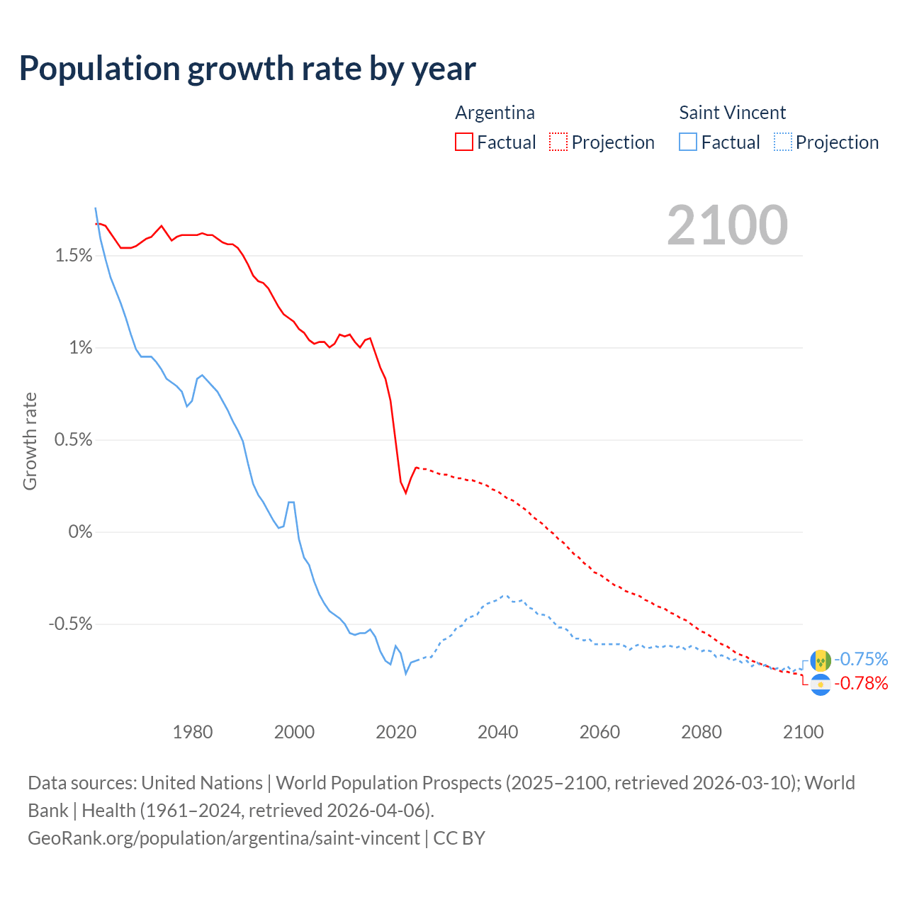 - For the last 10 years, Argentina has had an average growth rate of +0.64% per year vs -0.65% in Saint Vincent.