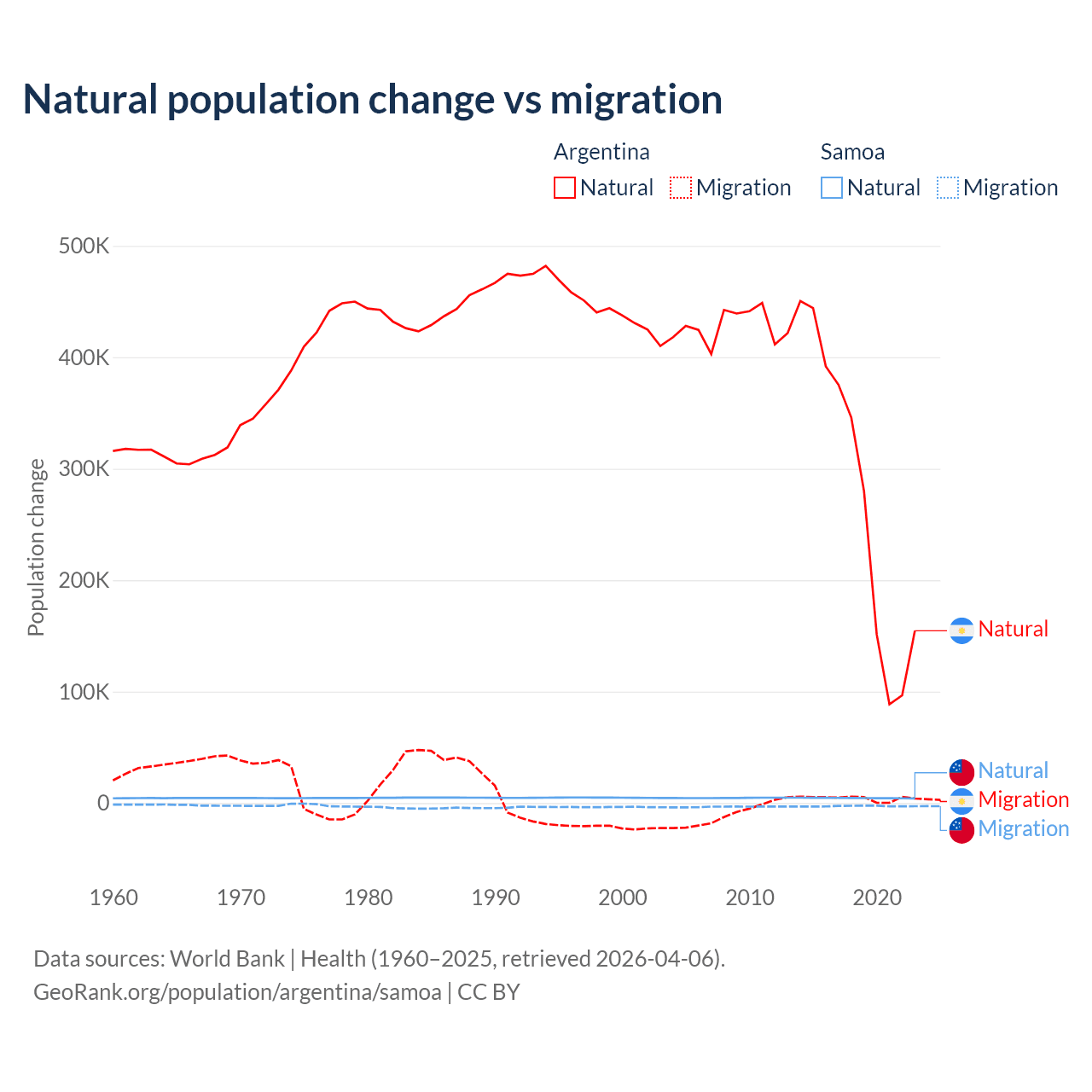 Over the last 10 years, 98.5% of the population change in Argentina is from natural causes (a gain of 2,779,031 people) and 1.52% is from migration (a gain of 42,871 people). In Samoa 62.5% is from natural causes (a gain of 45,436 people) and 37.5% is from migration (a loss of 27,246 people).