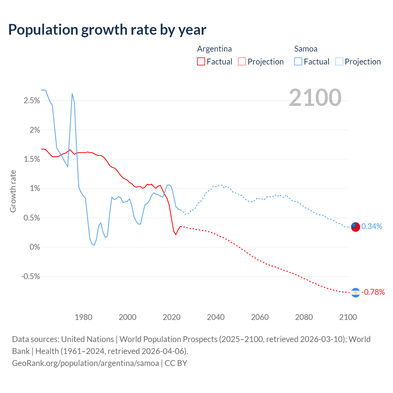 - For the last 10 years, Argentina has had an average growth rate of +0.64% per year vs +0.87% in Samoa.