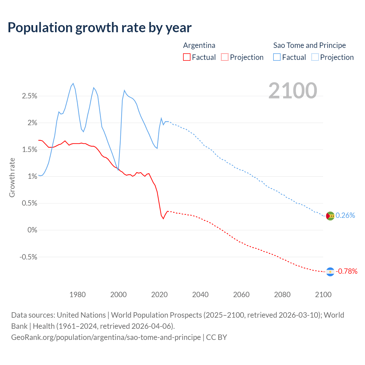 - For the last 10 years, Argentina has had an average growth rate of +0.64% per year vs +1.82% in Sao Tome and Principe.