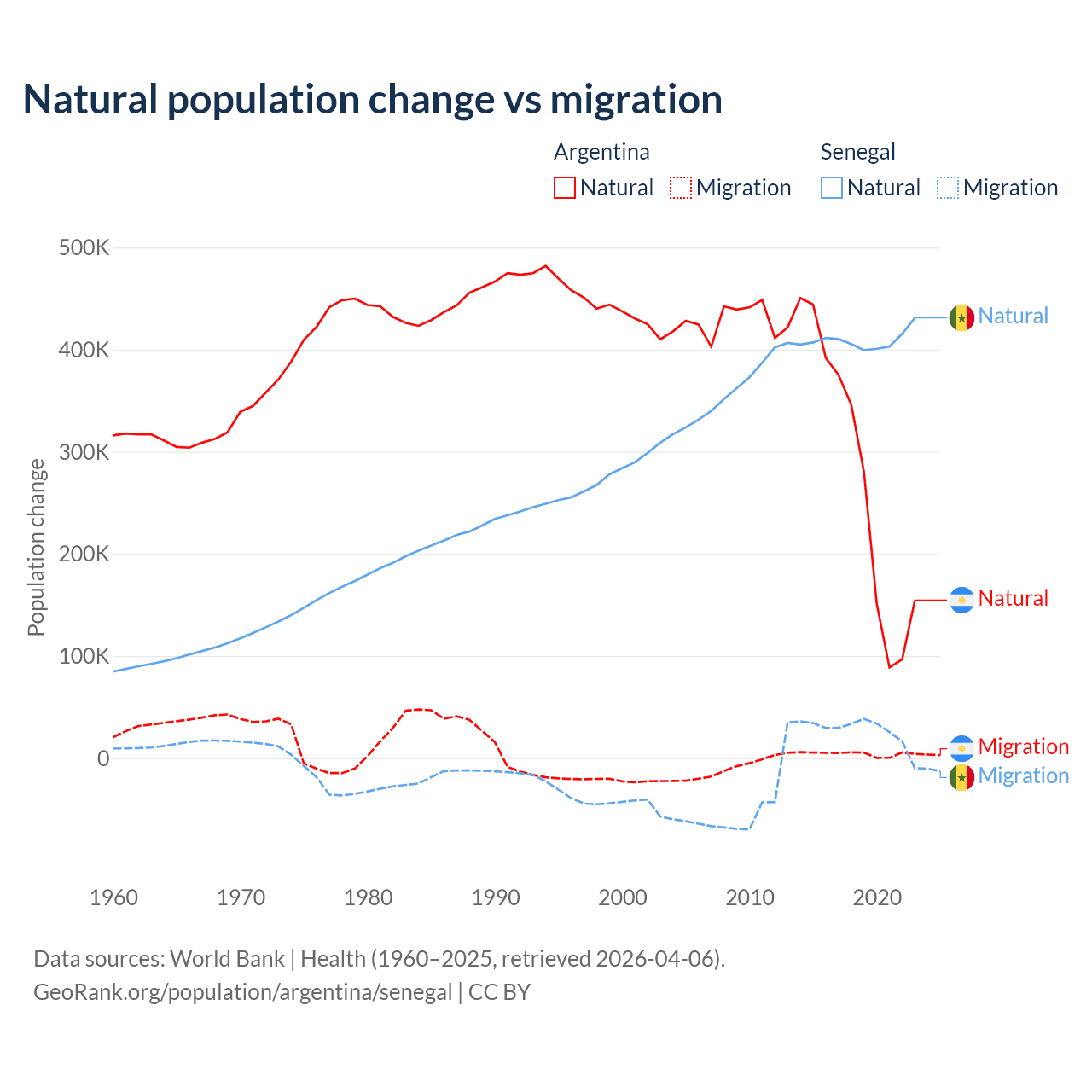 Over the last 10 years, 98.5% of the population change in Argentina is from natural causes (a gain of 2,779,031 people) and 1.52% is from migration (a gain of 42,871 people). In Senegal 93.9% is from natural causes (a gain of 4,089,205 people) and 6.13% is from migration (a gain of 267,266 people).