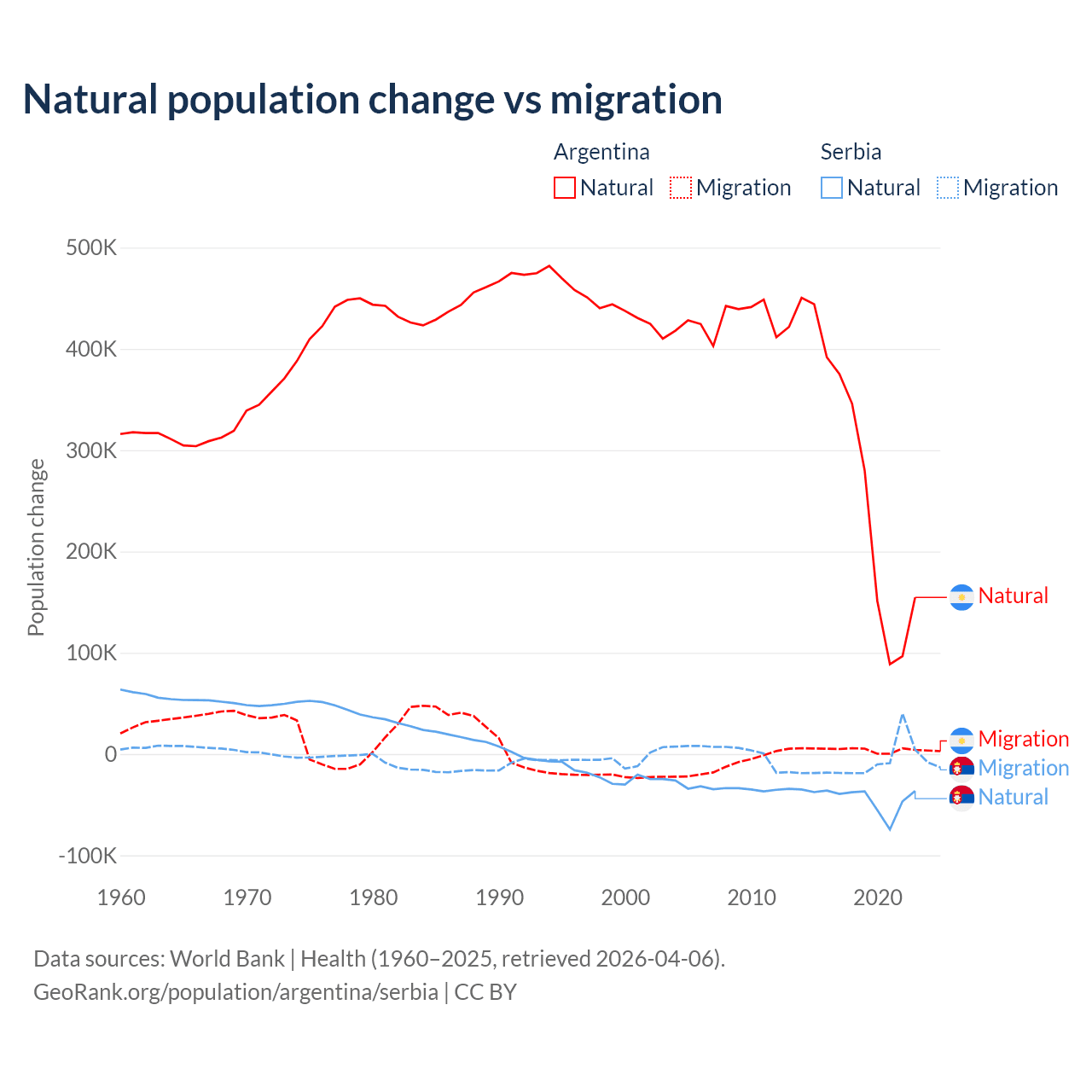 Over the last 10 years, 98.5% of the population change in Argentina is from natural causes (a gain of 2,779,031 people) and 1.52% is from migration (a gain of 42,871 people). In Serbia 83.3% is from natural causes (a loss of 435,148 people) and 16.7% is from migration (a loss of 87,110 people).