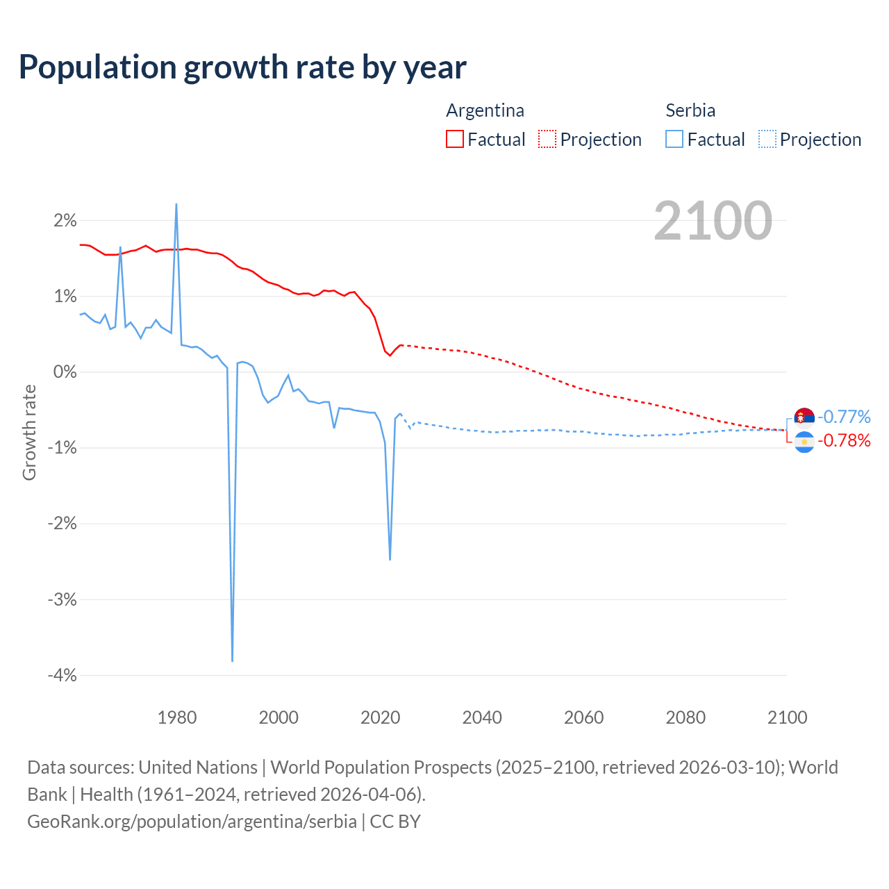 - For the last 10 years, Argentina has had an average growth rate of +0.64% per year vs -0.76% in Serbia.