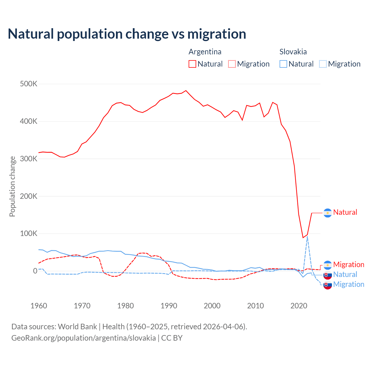 Over the last 10 years, 98.5% of the population change in Argentina is from natural causes (a gain of 2,779,031 people) and 1.52% is from migration (a gain of 42,871 people). In Slovakia 7.47% is from natural causes (a loss of 8,728 people) and 92.5% is from migration (a gain of 108,156 people).