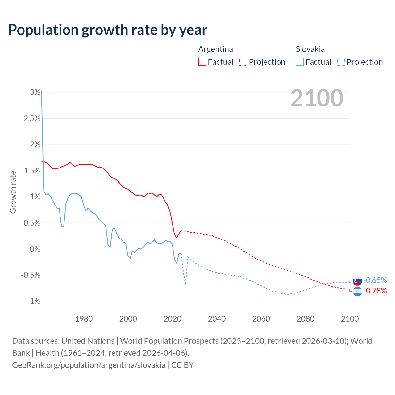 - For the last 10 years, Argentina has had an average growth rate of +0.64% per year vs +0.01% in Slovakia.