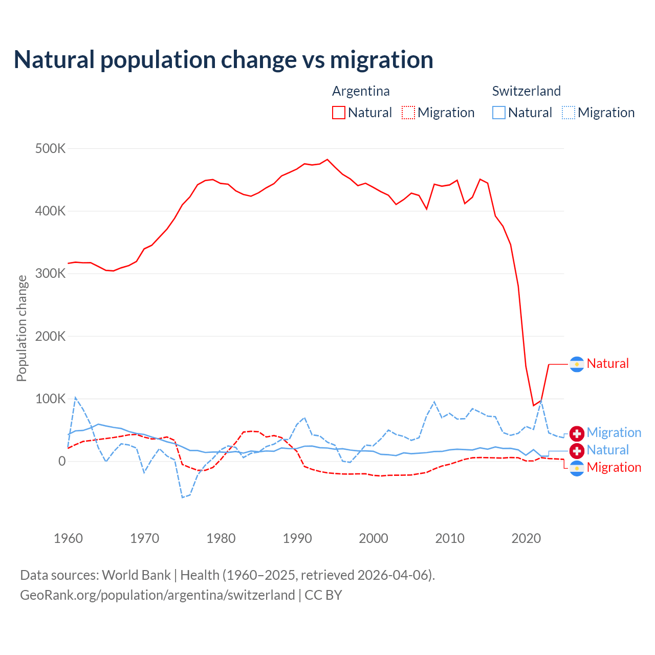 Over the last 10 years, 98.5% of the population change in Argentina is from natural causes (a gain of 2,779,031 people) and 1.52% is from migration (a gain of 42,871 people). In Switzerland 21.6% is from natural causes (a gain of 165,354 people) and 78.4% is from migration (a gain of 600,145 people).
