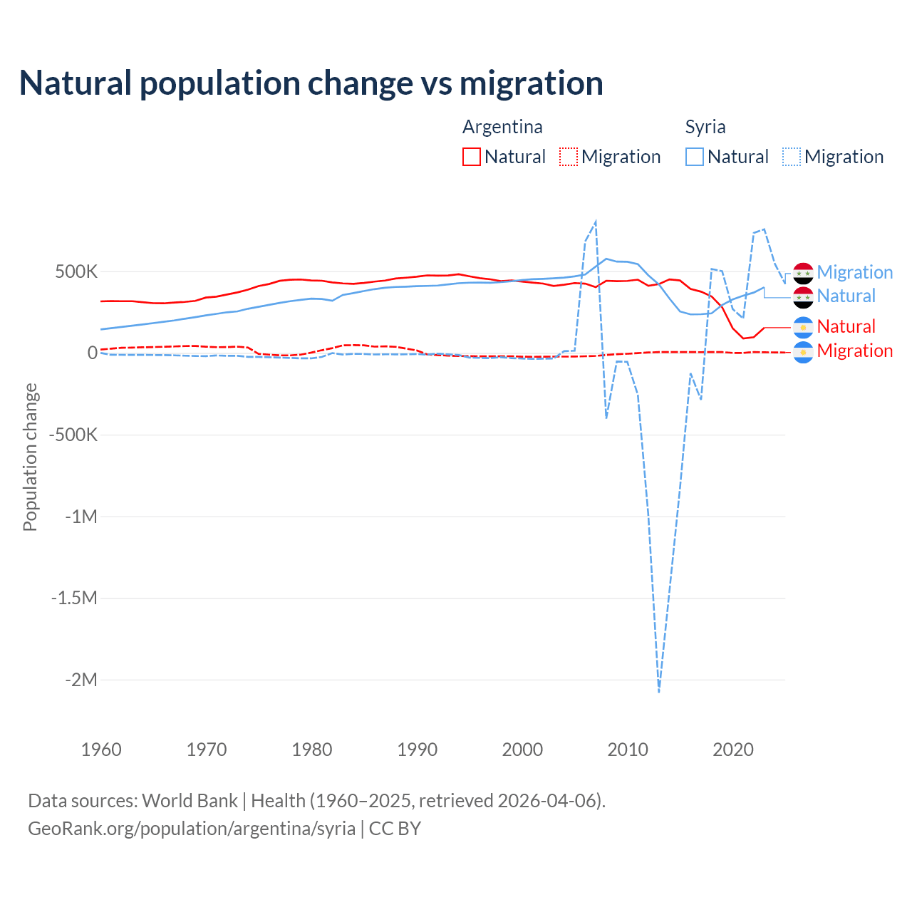 Over the last 10 years, 98.5% of the population change in Argentina is from natural causes (a gain of 2,779,031 people) and 1.52% is from migration (a gain of 42,871 people). In Syria 91.3% is from natural causes (a gain of 3,047,621 people) and 8.72% is from migration (a gain of 291,069 people).