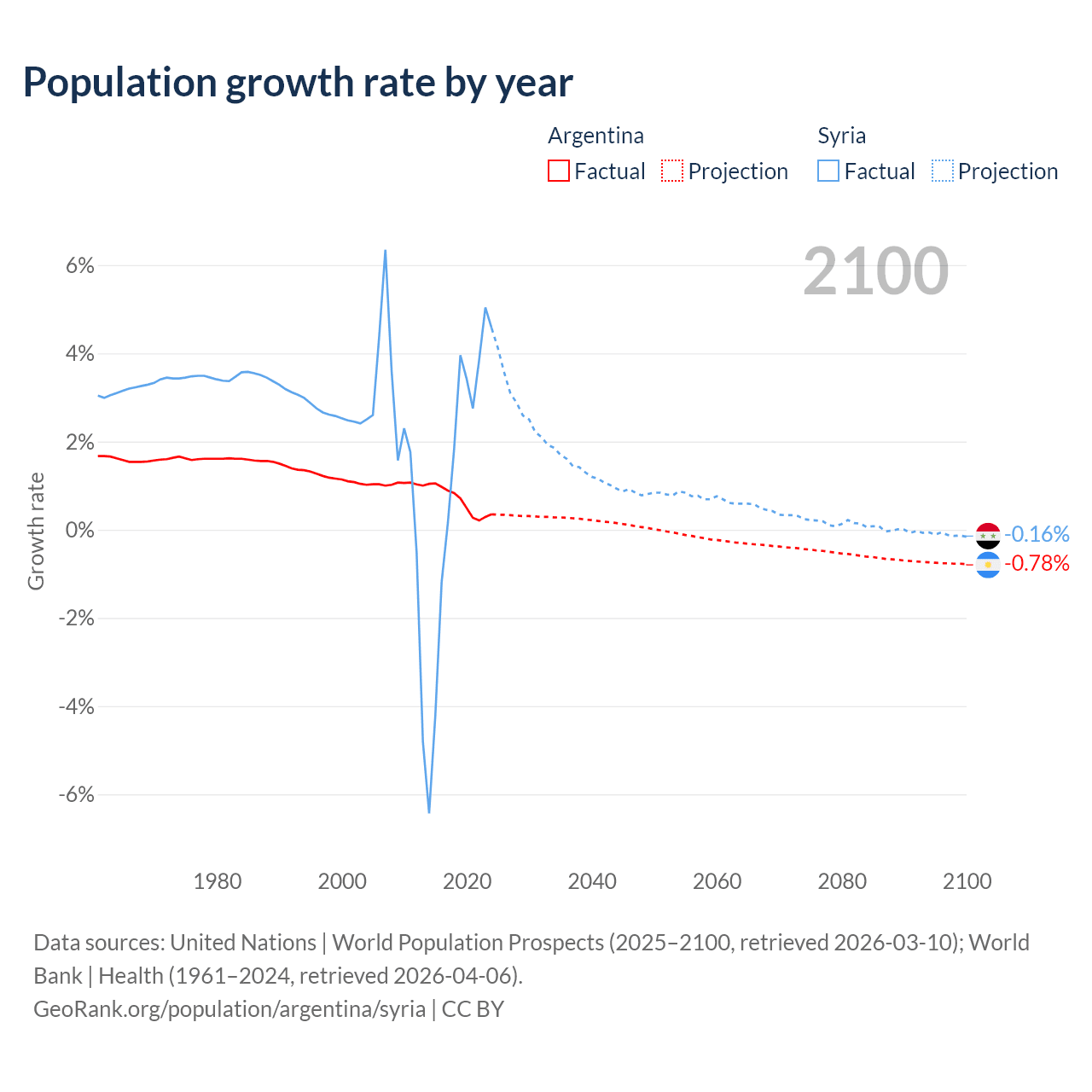 - For the last 10 years, Argentina has had an average growth rate of +0.64% per year vs +1.25% in Syria.