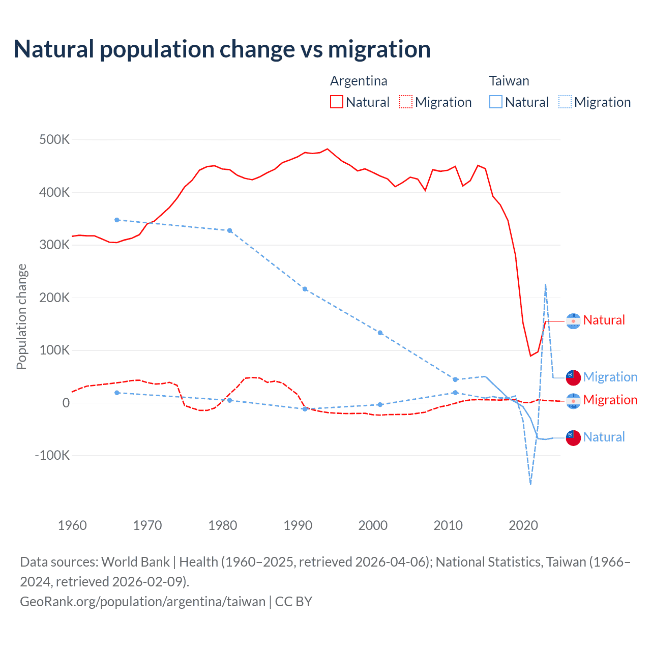 Over the last 10 years, 98.5% of the population change in Argentina is from natural causes (a gain of 2,779,031 people) and 1.52% is from migration (a gain of 42,871 people). In Taiwan 56.7% is from natural causes (a loss of 57,467 people) and 43.3% is from migration (a gain of 43,884 people).