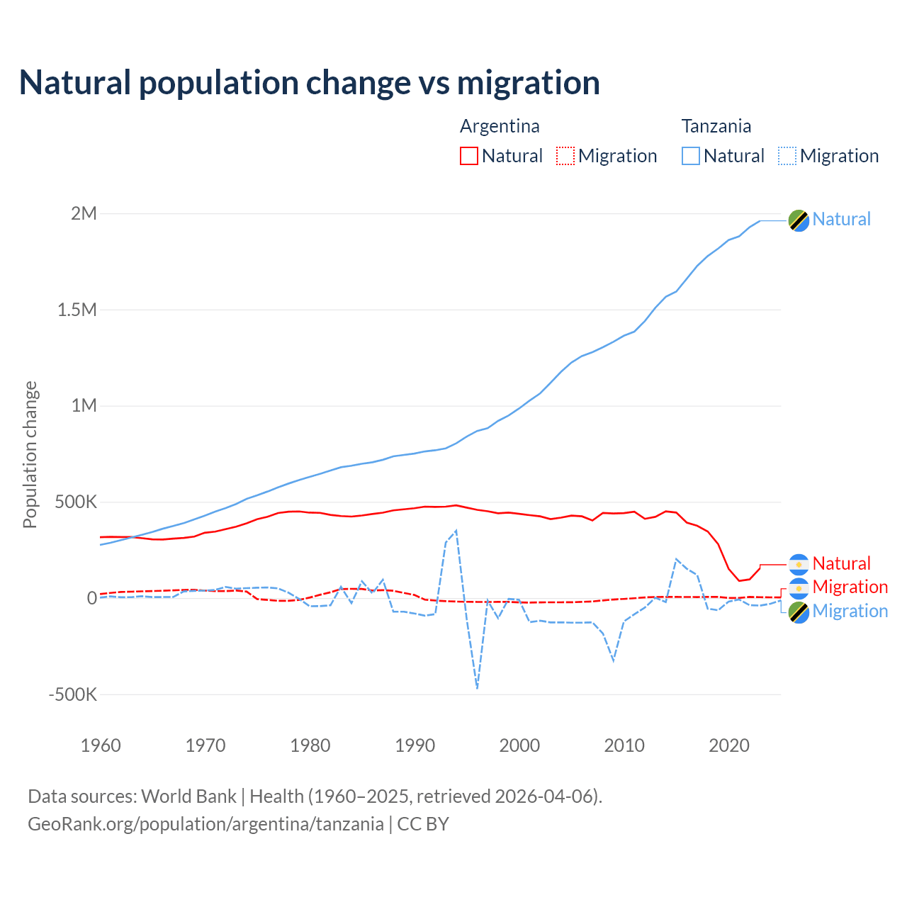 Over the last 10 years, 98.5% of the population change in Argentina is from natural causes (a gain of 2,779,031 people) and 1.52% is from migration (a gain of 42,871 people). In Tanzania 98.7% is from natural causes (a gain of 17,769,541 people) and 1.27% is from migration (a gain of 229,466 people).