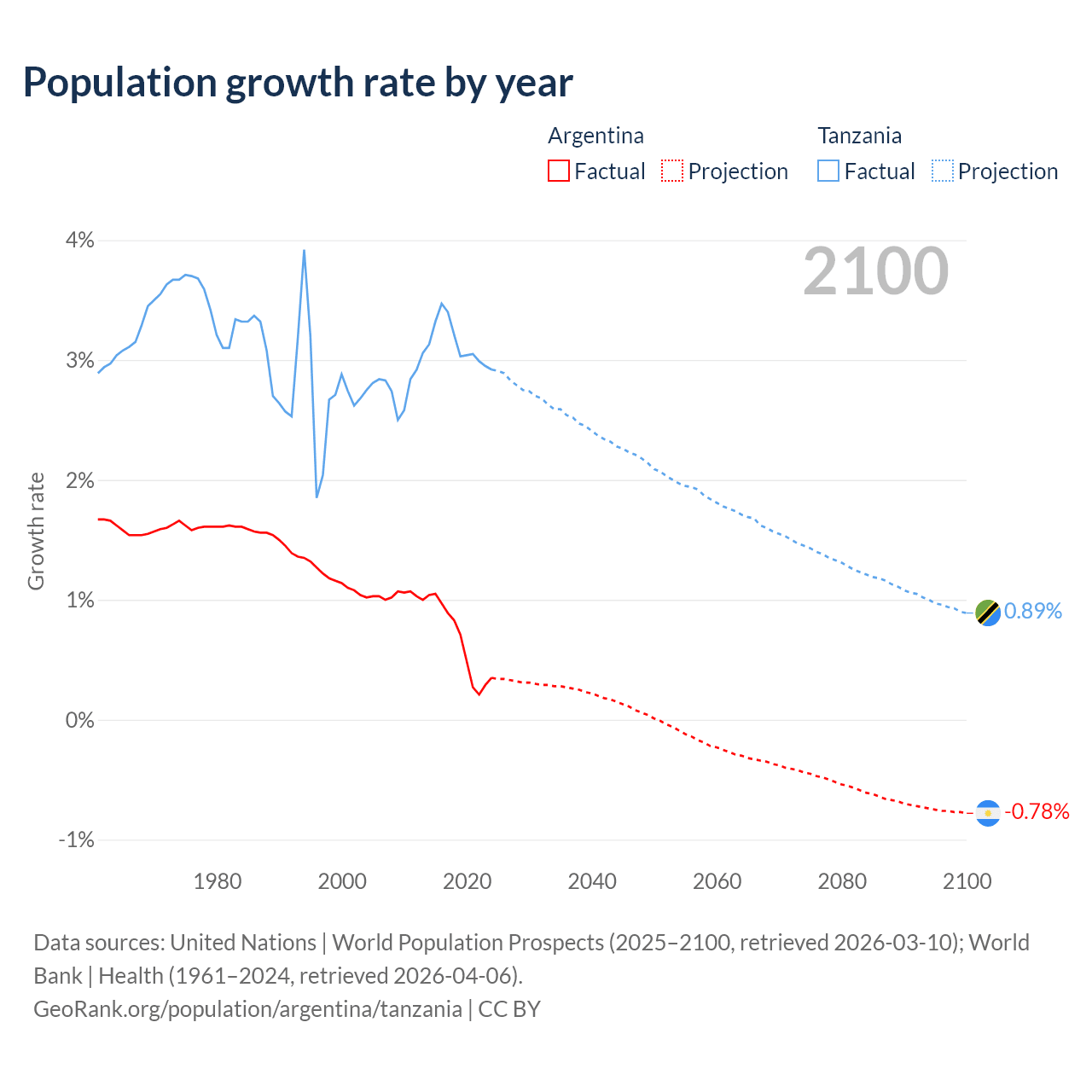 - For the last 10 years, Argentina has had an average growth rate of +0.64% per year vs +3.13% in Tanzania.