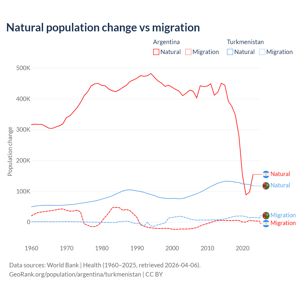 Over the last 10 years, 98.5% of the population change in Argentina is from natural causes (a gain of 2,779,031 people) and 1.52% is from migration (a gain of 42,871 people). In Turkmenistan 89.2% is from natural causes (a gain of 1,270,228 people) and 10.8% is from migration (a gain of 154,379 people).