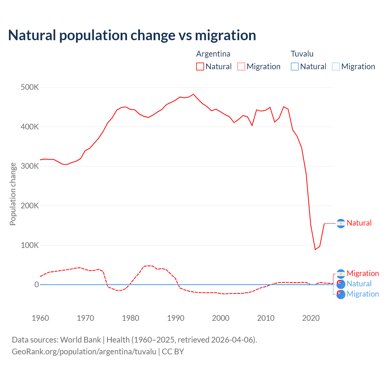 Over the last 10 years, 98.5% of the population change in Argentina is from natural causes (a gain of 2,779,031 people) and 1.52% is from migration (a gain of 42,871 people). In Tuvalu 35.5% is from natural causes (a gain of 1,556 people) and 64.5% is from migration (a loss of 2,827 people).