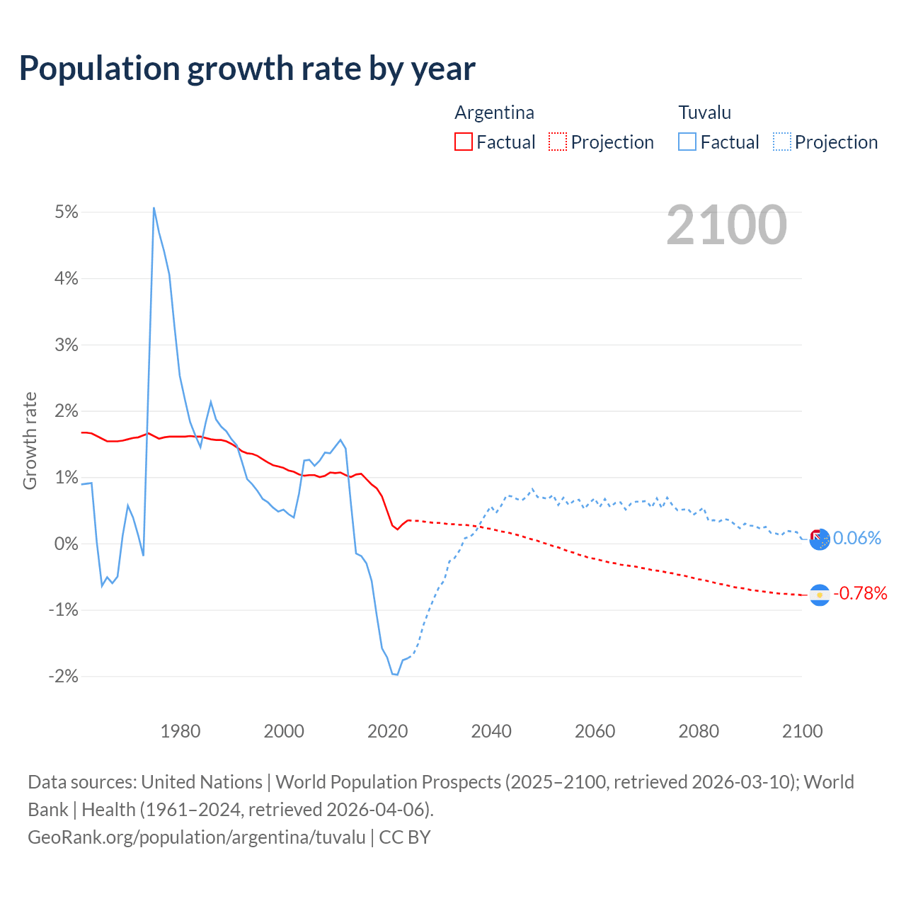 - For the last 10 years, Argentina has had an average growth rate of +0.64% per year vs -1.19% in Tuvalu.