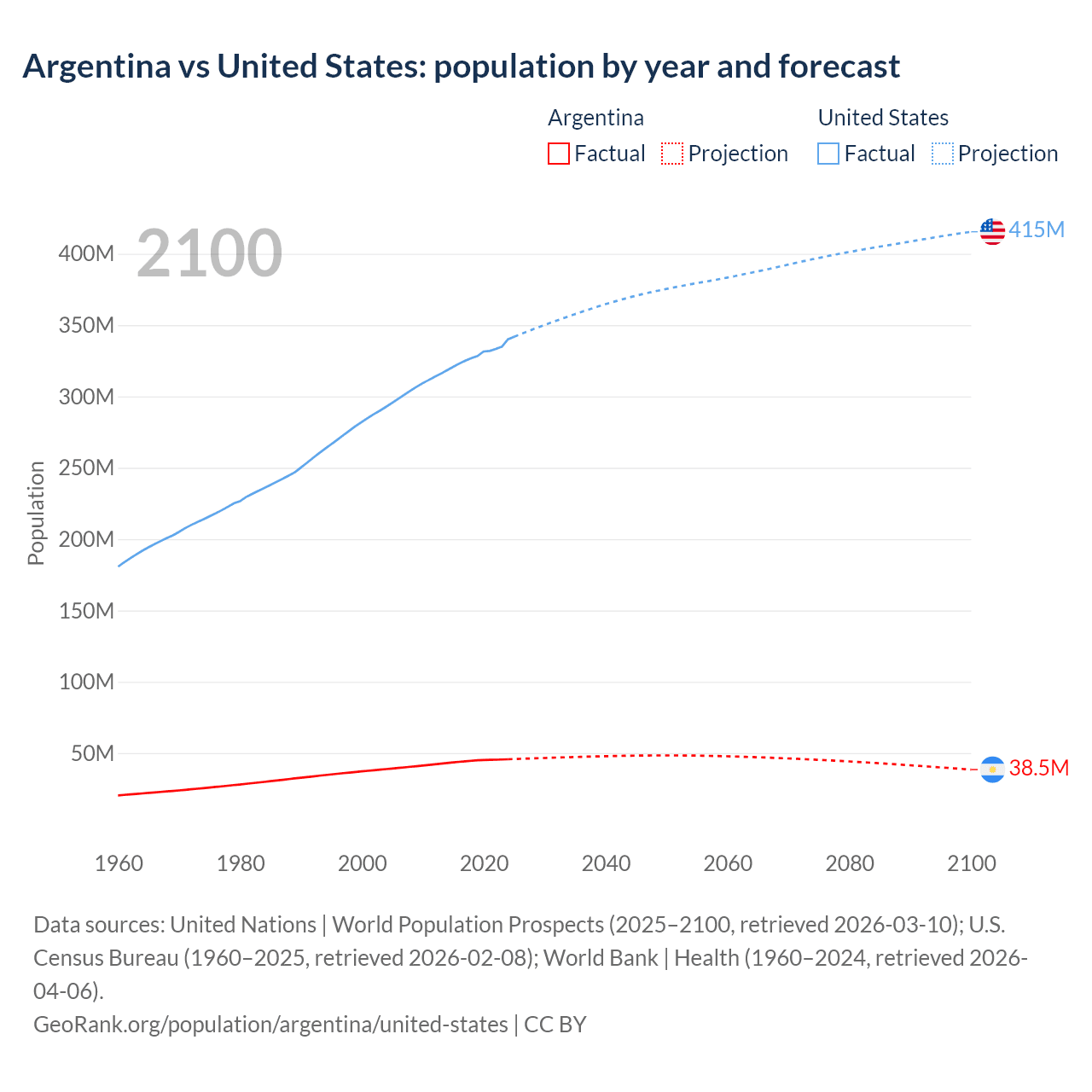 Argentina vs United States: population by year and forecast