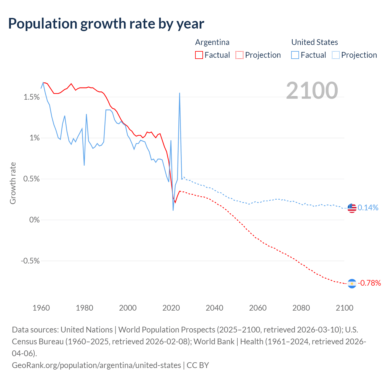 Data sources: World Bank | Health (1960–2024, retrieved 2026-04-06); United Nations | World Population Prospects (1960–2026, retrieved 2026-03-10); U.S. Census Bureau (1960–2025, retrieved 2026-02-08); Central Intelligence Agency (CIA) (2000–2019, retrieved 2026-02-20).
