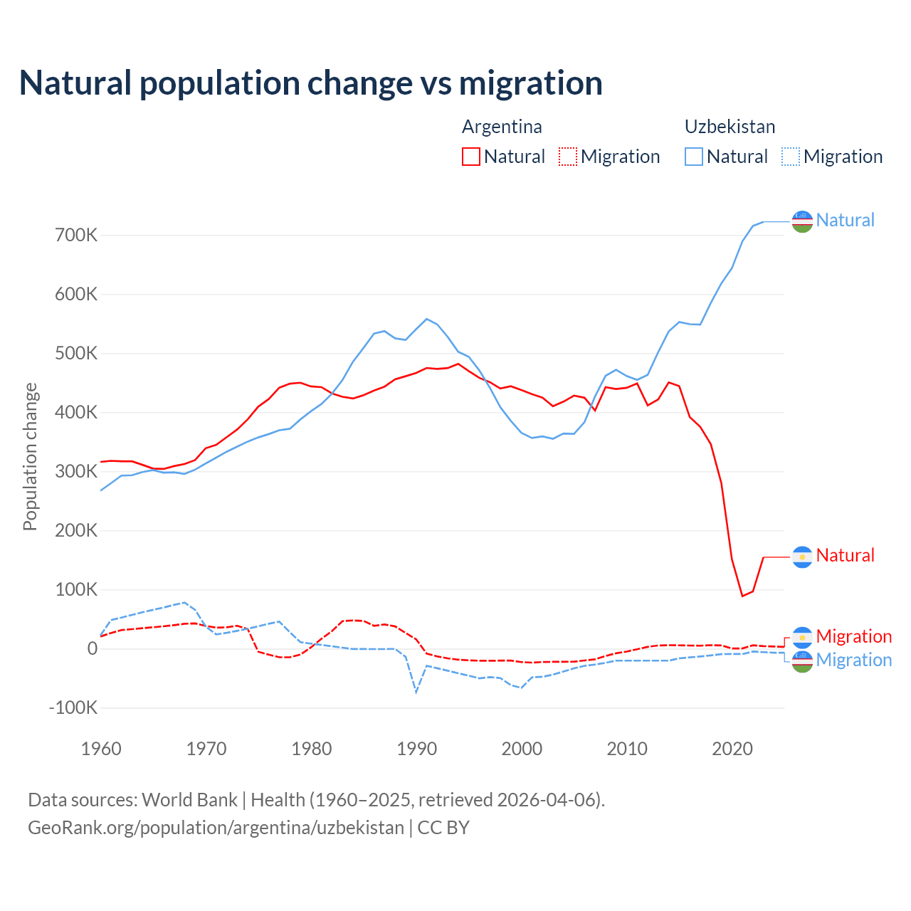 Over the last 10 years, 98.5% of the population change in Argentina is from natural causes (a gain of 2,779,031 people) and 1.52% is from migration (a gain of 42,871 people). In Uzbekistan 98.2% is from natural causes (a gain of 6,161,117 people) and 1.84% is from migration (a loss of 115,398 people).