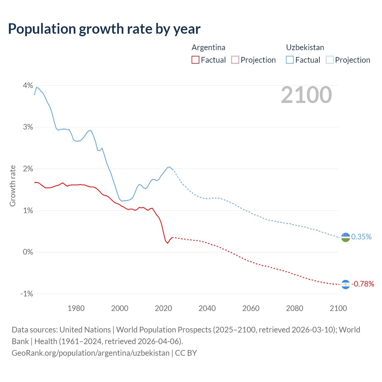 - For the last 10 years, Argentina has had an average growth rate of +0.64% per year vs +1.85% in Uzbekistan.