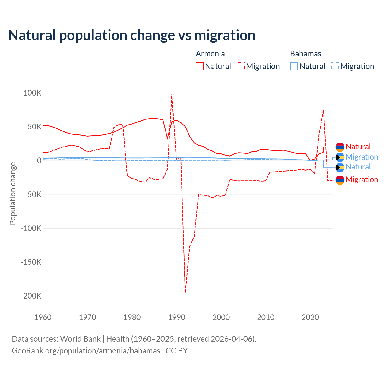 Over the last 10 years, 93.5% of the population change in Armenia is from natural causes (a gain of 97,267 people) and 6.54% is from migration (a loss of 6,808 people). In the Bahamas 56.9% is from natural causes (a gain of 11,209 people) and 43.1% is from migration (a gain of 8,495 people).
