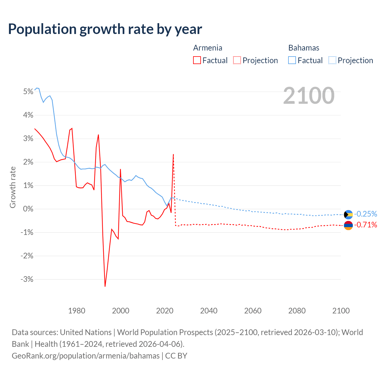 - For the last 10 years, Armenia has had an average growth rate of +0.04% per year vs +0.52% in the Bahamas.