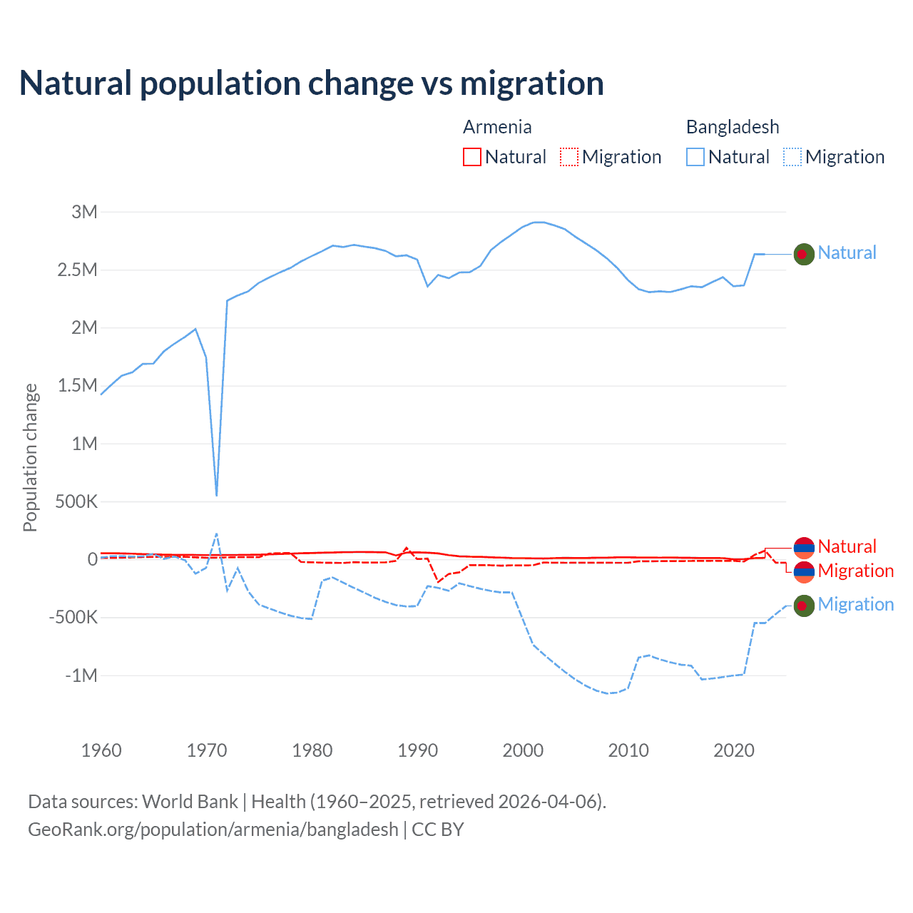 Over the last 10 years, 93.5% of the population change in Armenia is from natural causes (a gain of 97,267 people) and 6.54% is from migration (a loss of 6,808 people). In Bangladesh 73.1% is from natural causes (a gain of 24,148,039 people) and 26.9% is from migration (a loss of 8,897,408 people).