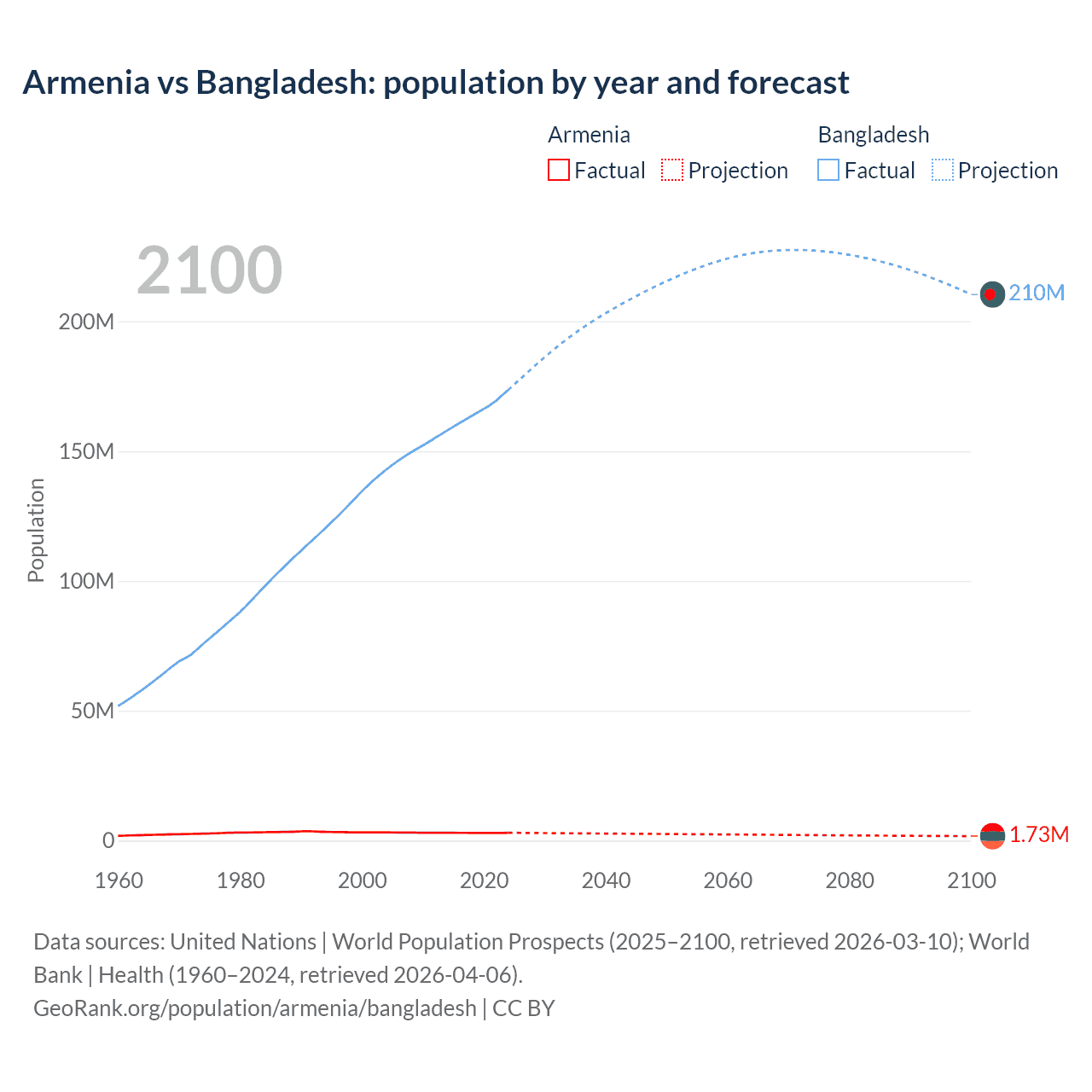 The latest officially reported population of Armenia was 3,033,500 in 2024 vs 173,562,364 people in Bangladesh in 2024. In 2026, based on the adjusted UN estimation, the current Armenia's population is 2,989,841 people compared to 178,415,186 in Bangladesh.