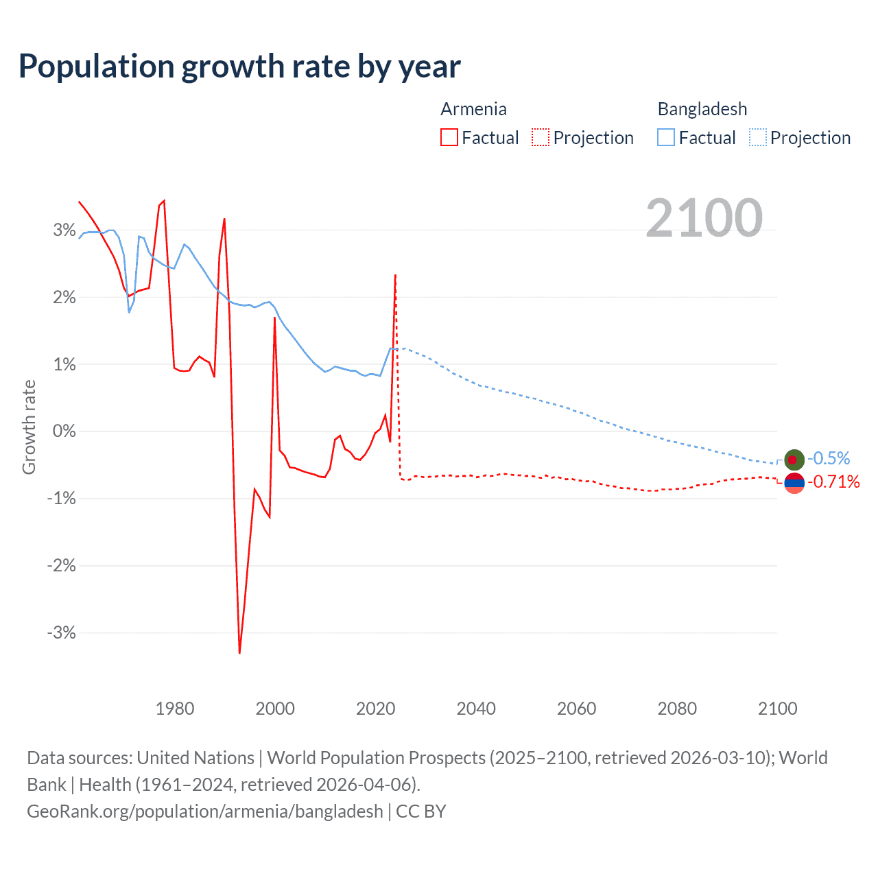 - For the last 10 years, Armenia has had an average growth rate of +0.04% per year vs +0.94% in Bangladesh.