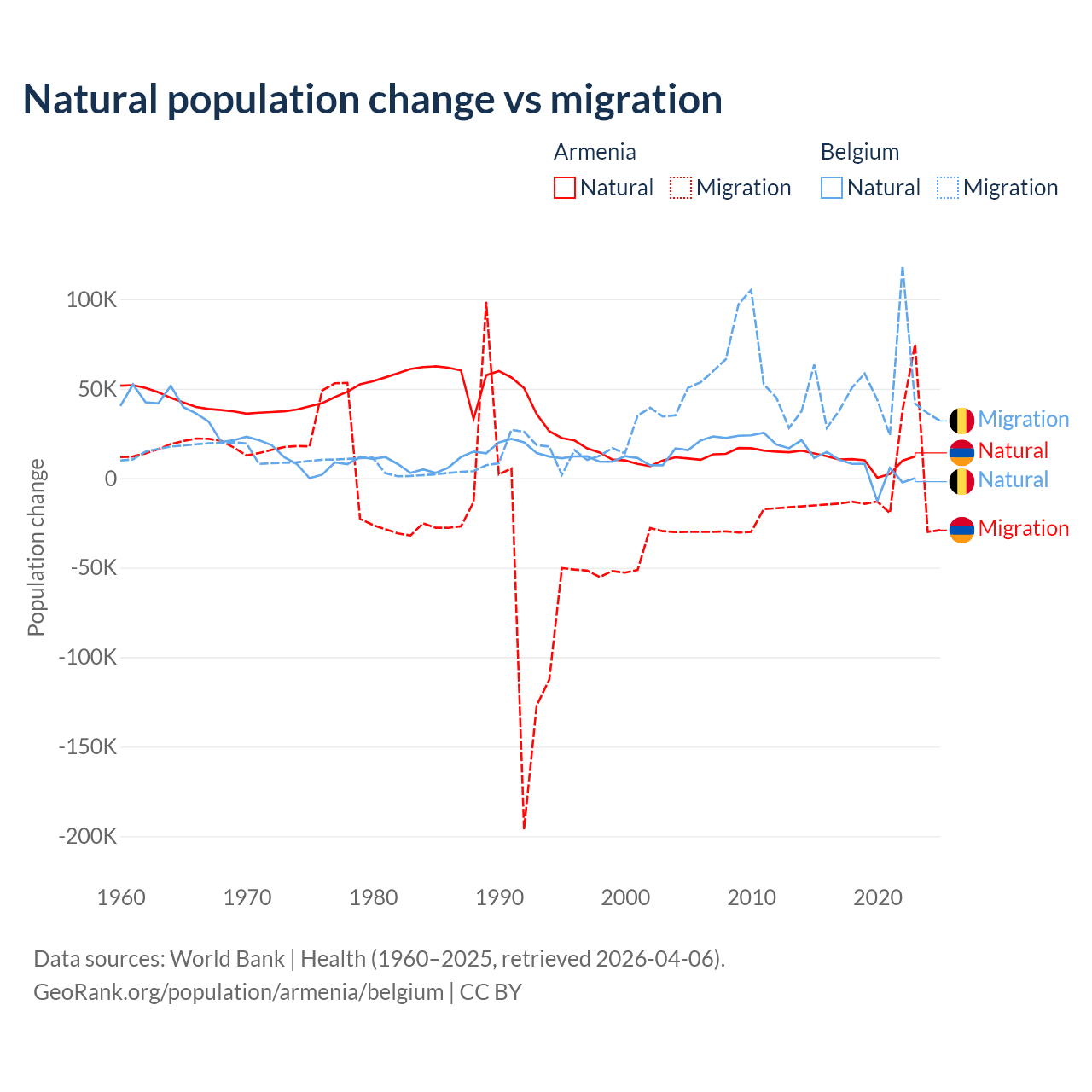 Over the last 10 years, 93.5% of the population change in Armenia is from natural causes (a gain of 97,267 people) and 6.54% is from migration (a loss of 6,808 people). In Belgium 11.3% is from natural causes (a gain of 64,346 people) and 88.7% is from migration (a gain of 504,240 people).