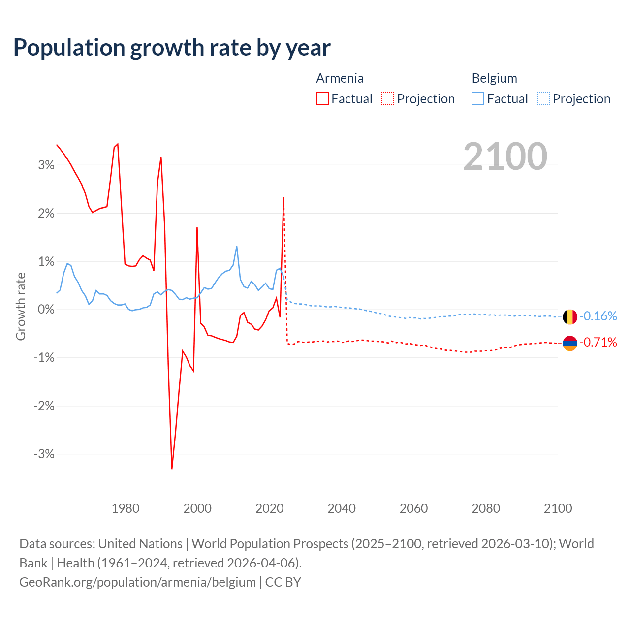 - For the last 10 years, Armenia has had an average growth rate of +0.04% per year vs +0.55% in Belgium.