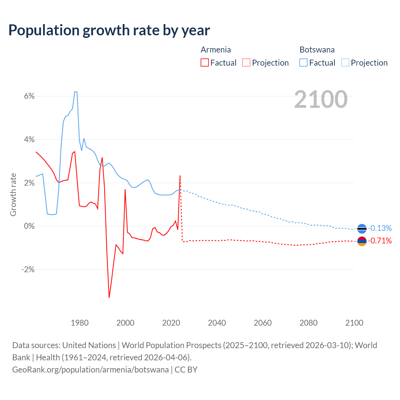 - For the last 10 years, Armenia has had an average growth rate of +0.04% per year vs +1.5% in Botswana.