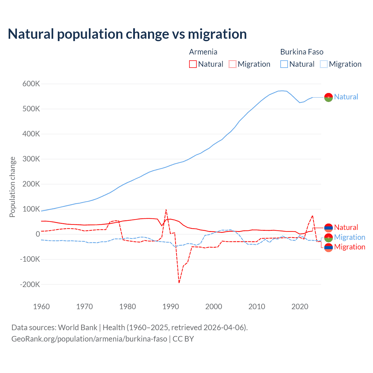Over the last 10 years, 93.5% of the population change in Armenia is from natural causes (a gain of 97,267 people) and 6.54% is from migration (a loss of 6,808 people). In Burkina Faso 96.9% is from natural causes (a gain of 5,506,960 people) and 3.13% is from migration (a loss of 177,923 people).
