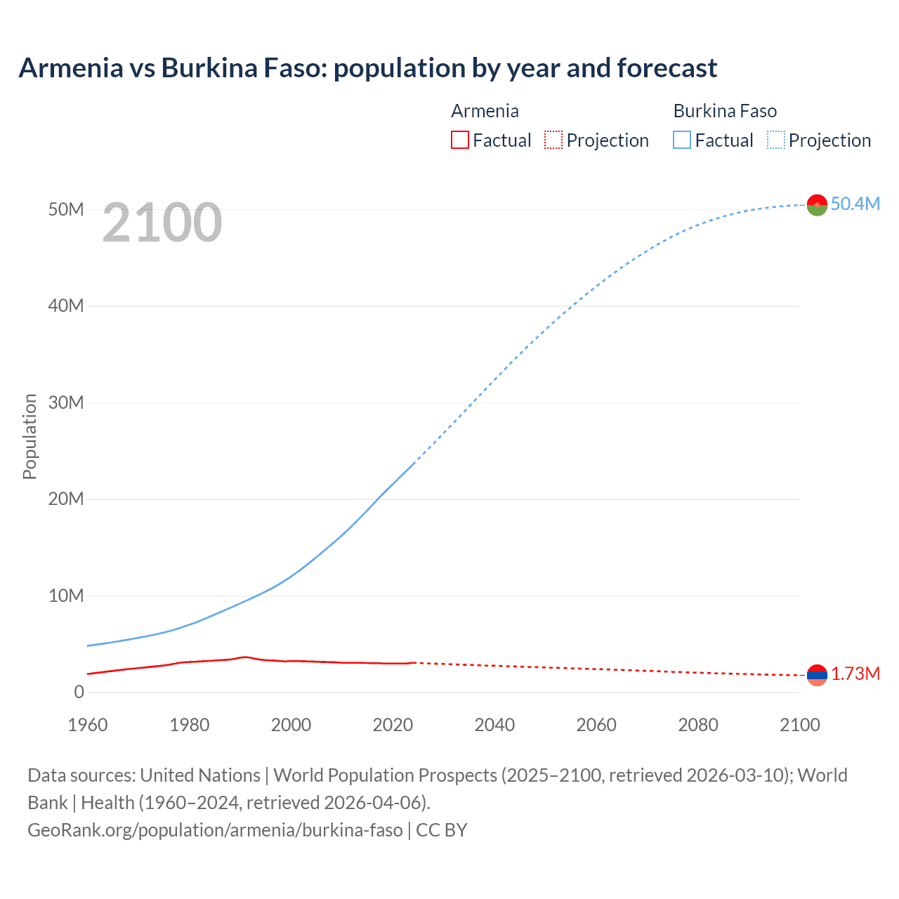Armenia vs Burkina Faso: population by year and forecast