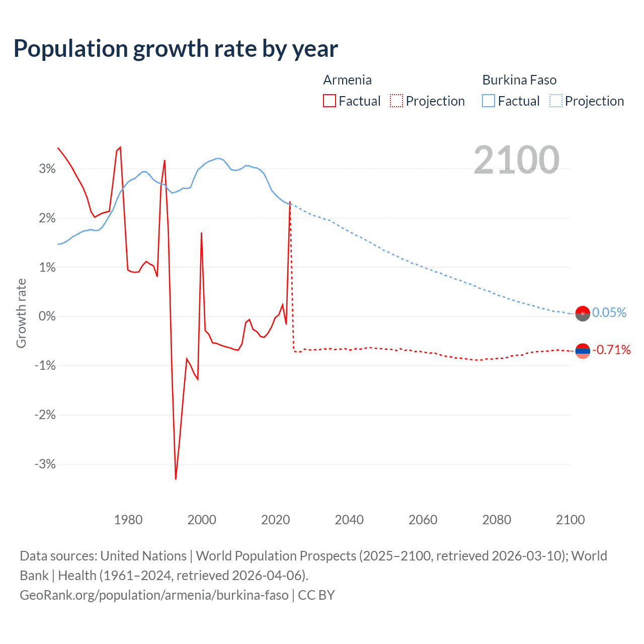- For the last 10 years, Armenia has had an average growth rate of +0.04% per year vs +2.63% in Burkina Faso.