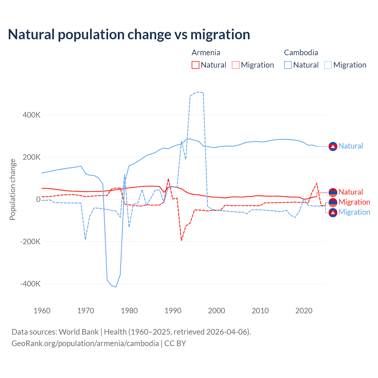 Over the last 10 years, 93.5% of the population change in Armenia is from natural causes (a gain of 97,267 people) and 6.54% is from migration (a loss of 6,808 people). In Cambodia 85.2% is from natural causes (a gain of 2,724,147 people) and 14.8% is from migration (a loss of 474,505 people).