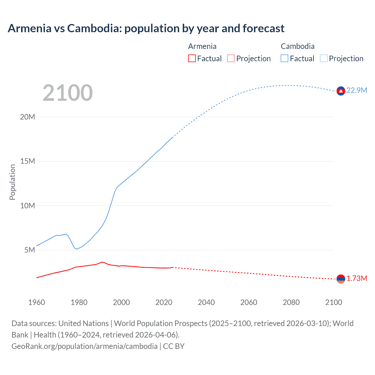 The latest officially reported population of Armenia was 3,033,500 in 2024 vs 17,638,801 people in Cambodia in 2024. In 2026, based on the adjusted UN estimation, the current Armenia's population is 2,989,841 people compared to 18,113,986 in Cambodia.