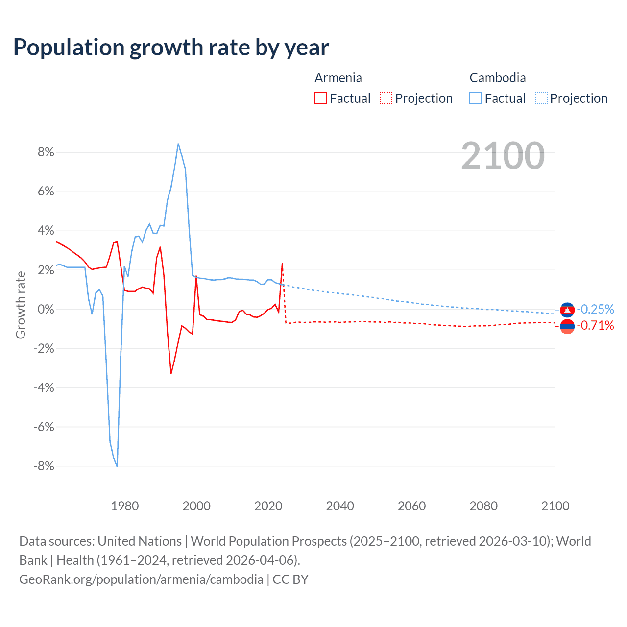 - For the last 10 years, Armenia has had an average growth rate of +0.04% per year vs +1.38% in Cambodia.
