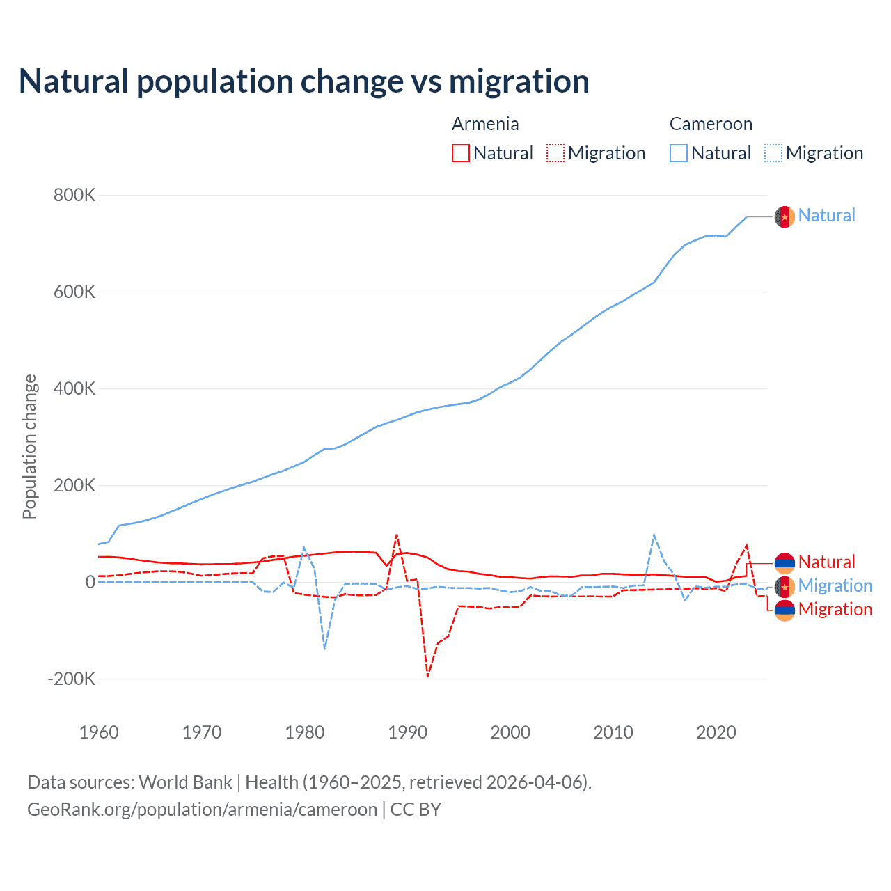 Over the last 10 years, 93.5% of the population change in Armenia is from natural causes (a gain of 97,267 people) and 6.54% is from migration (a loss of 6,808 people). In Cameroon 99.1% is from natural causes (a gain of 6,982,395 people) and 0.9% is from migration (a gain of 63,139 people).