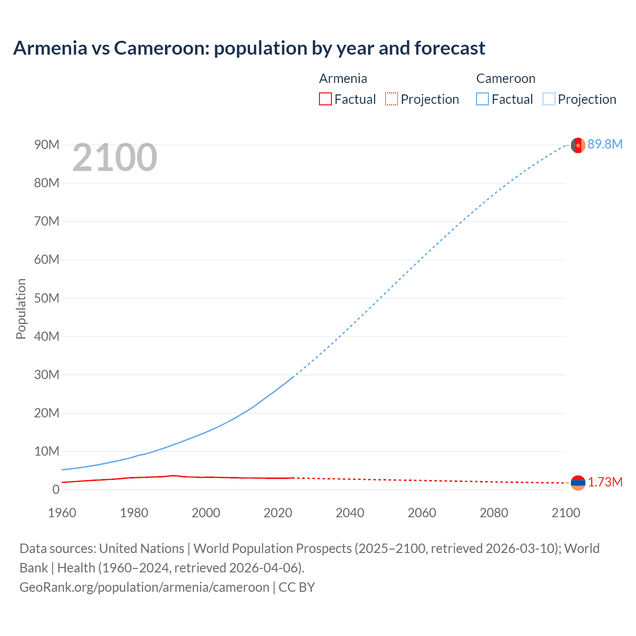 The latest officially reported population of Armenia was 3,033,500 in 2024 vs 29,123,744 people in Cameroon in 2024. In 2026, based on the adjusted UN estimation, the current Armenia's population is 2,989,841 people compared to 30,864,115 in Cameroon.