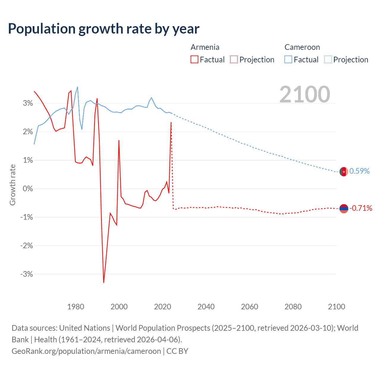- For the last 10 years, Armenia has had an average growth rate of +0.04% per year vs +2.84% in Cameroon.