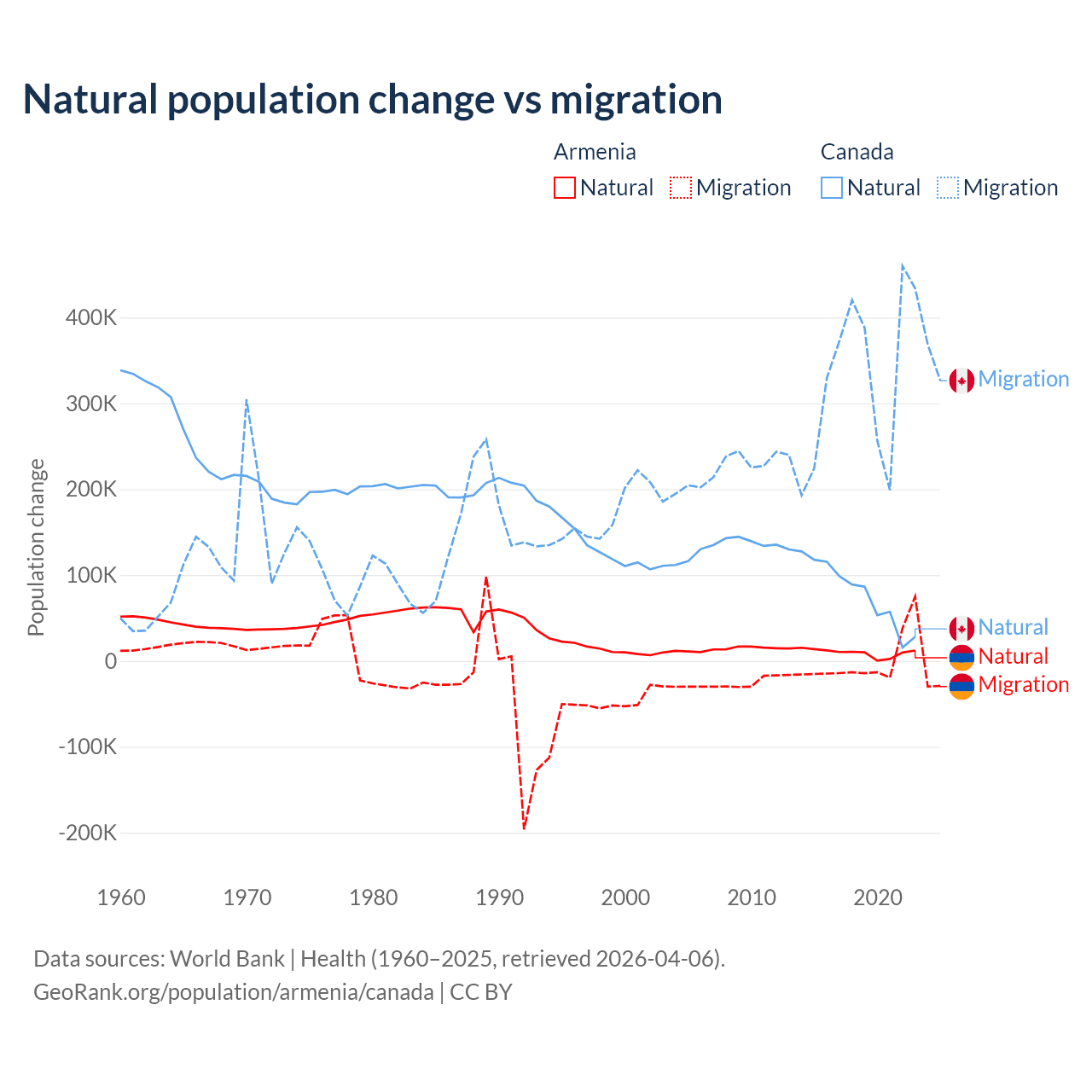 Over the last 10 years, 93.5% of the population change in Armenia is from natural causes (a gain of 97,267 people) and 6.54% is from migration (a loss of 6,808 people). In Canada 19.4% is from natural causes (a gain of 789,345 people) and 80.6% is from migration (a gain of 3,276,554 people).