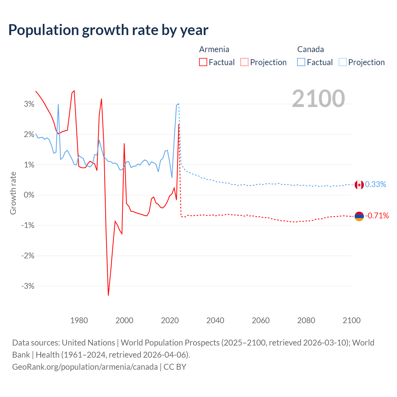 - For the last 10 years, Armenia has had an average growth rate of +0.04% per year vs +1.5% in Canada.