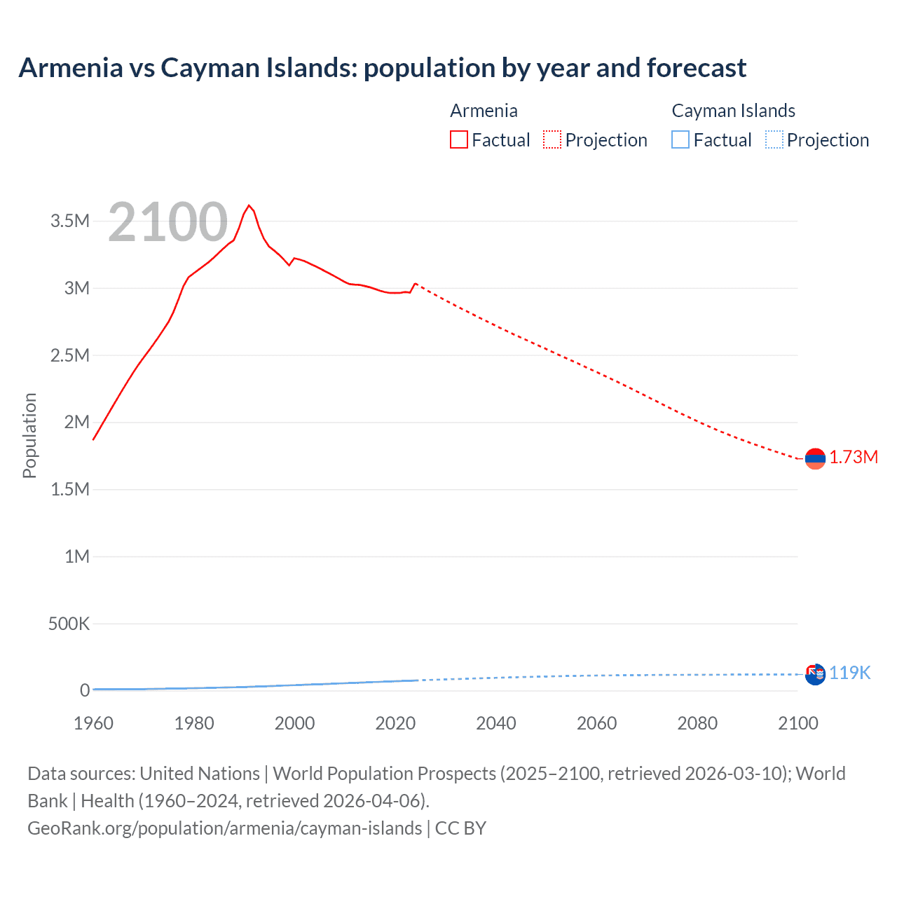 The latest officially reported population of Armenia was 3,033,500 in 2024 vs 74,457 people in the Cayman Islands in 2024. In 2026, based on the adjusted UN estimation, the current Armenia's population is 2,989,841 people compared to 77,619 in the Cayman Islands.